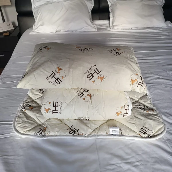Pilotă premium 4 anotimpuri pentru pătuț copii/bebeluși, lavabilă la mașină (program lână 30°C), cu umplutură 100% lână merino și înveliș crem „oiță” din bumbac OEKO-TEX® 100 — izolație sporită, respirabilitate naturală și confort controlat.
