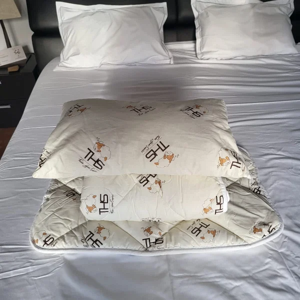 Pilotă 4 anotimpuri pentru pătuț copii/bebeluși, lavabilă la mașină (program lână 30°C), cu umplutură 100% lână merino și înveliș crem cu imprimeu „oiță”, bumbac OEKO-TEX® 100 — microclimat echilibrat, respirabil și uscat pentru somnul celor mici. Un produs de calitate excepțională merino.com.ro by THS.