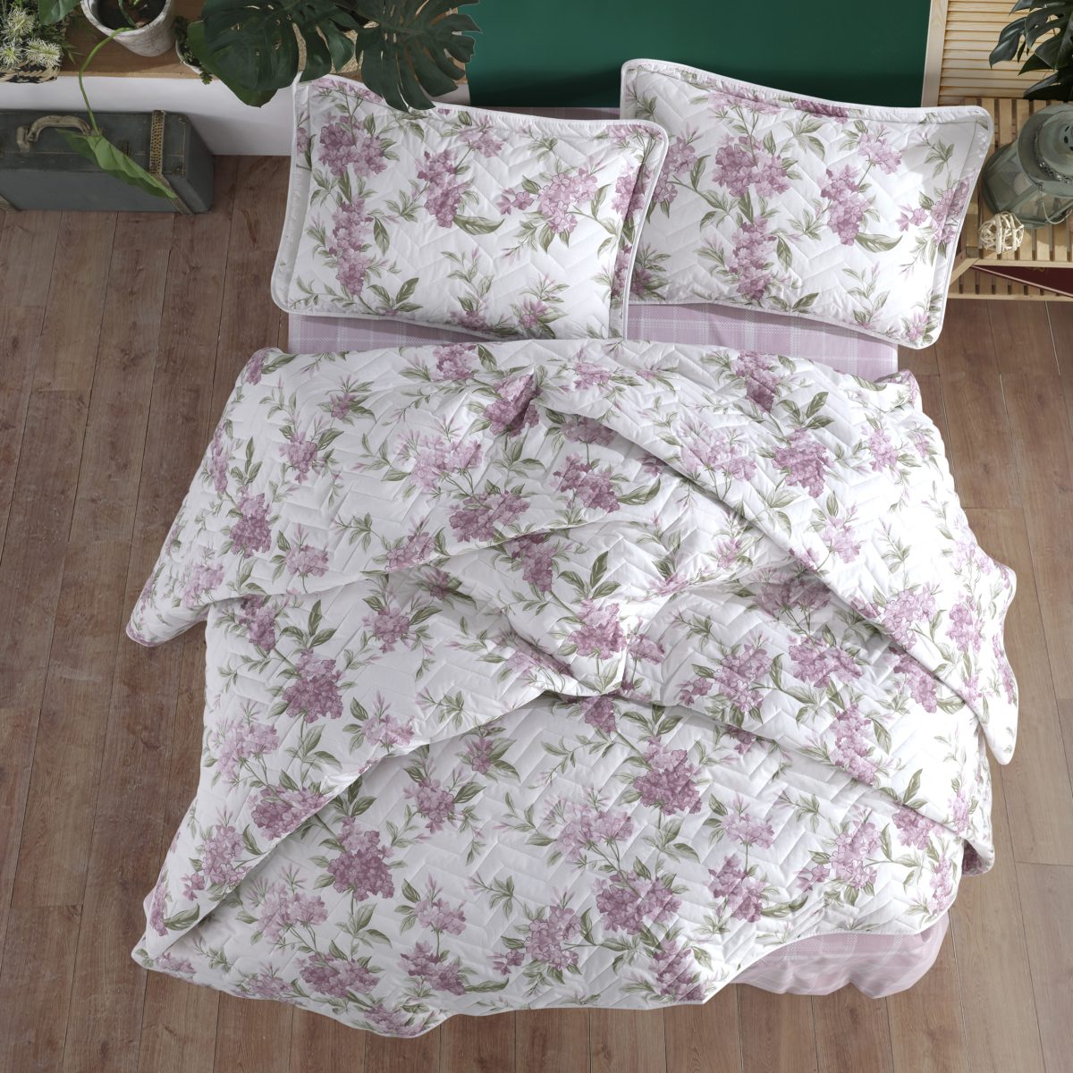 Set format dintr-o cuvertură matlasată reversibilă și două fețe de pernă, realizat din bumbac ranforce 100%. Design floral cu accente verzi și roz, perfect pentru completarea unui spațiu echilibrat și aerisit.