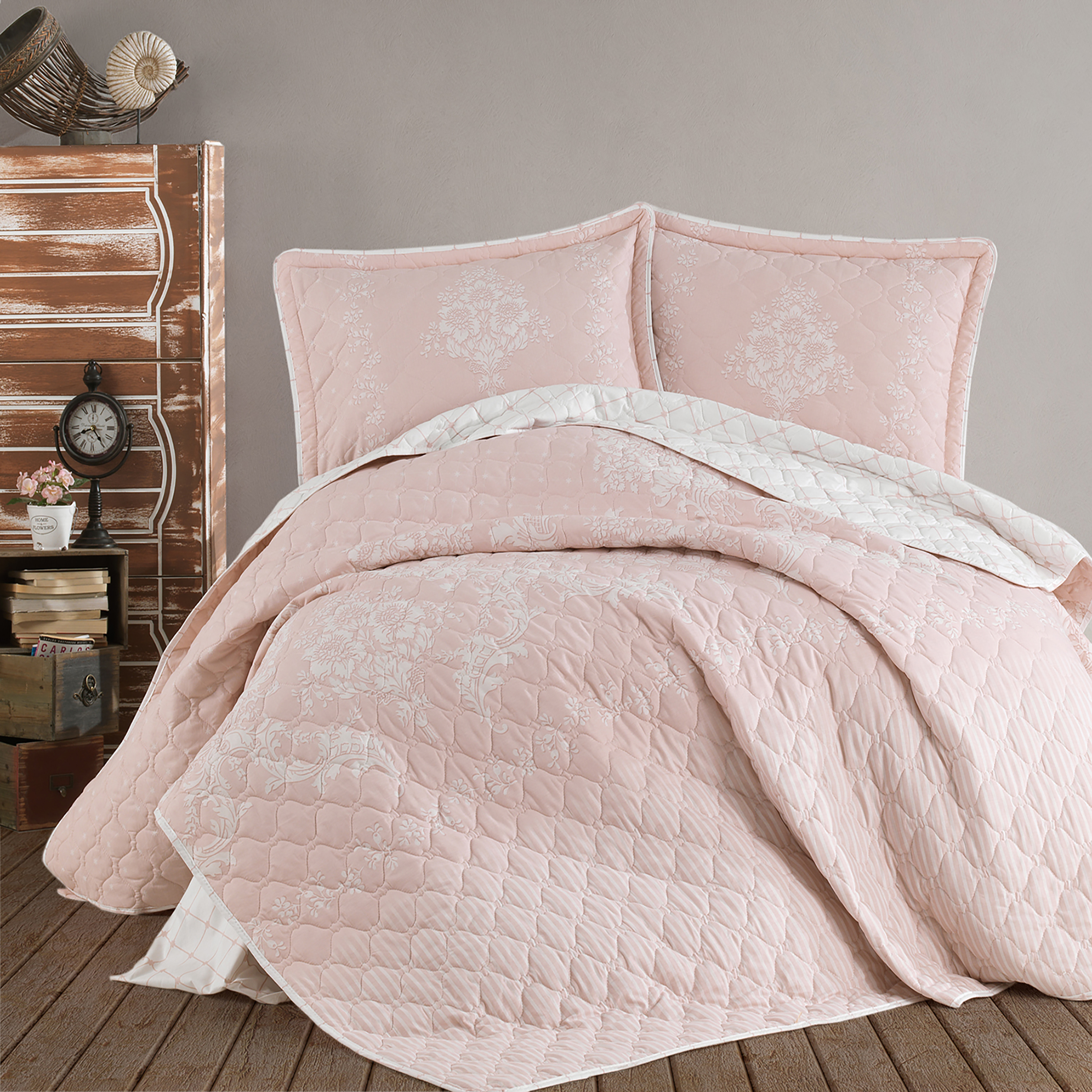 Cuvertură matlasată reversibilă pentru două persoane, realizată din bumbac 100% ranforce, cu model floral alb pe fundal roz pudrat. Setul include două fețe de pernă. O alegere practică și estetică pentru spații cu detalii feminine discrete.