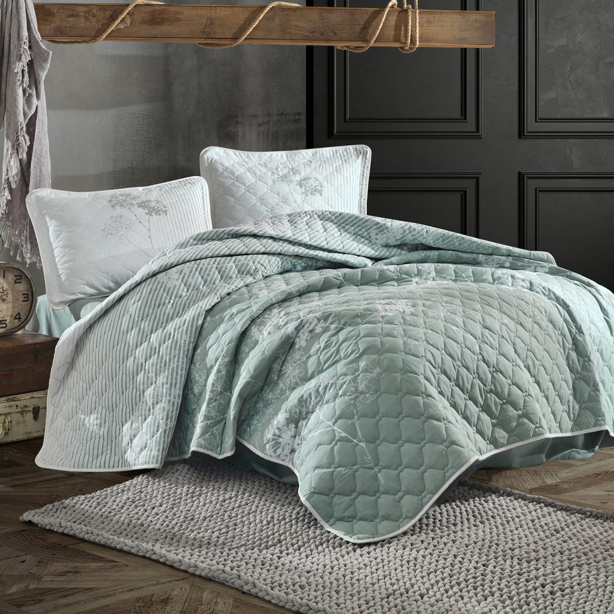 Cuvertură matlasată pentru două persoane, cu design contrastant: verde pal pentru cuvertură și alb curat pentru fețele de pernă. Realizată din bumbac ranforce, oferă versatilitate datorită caracterului reversibil și unei croieli echilibrate.