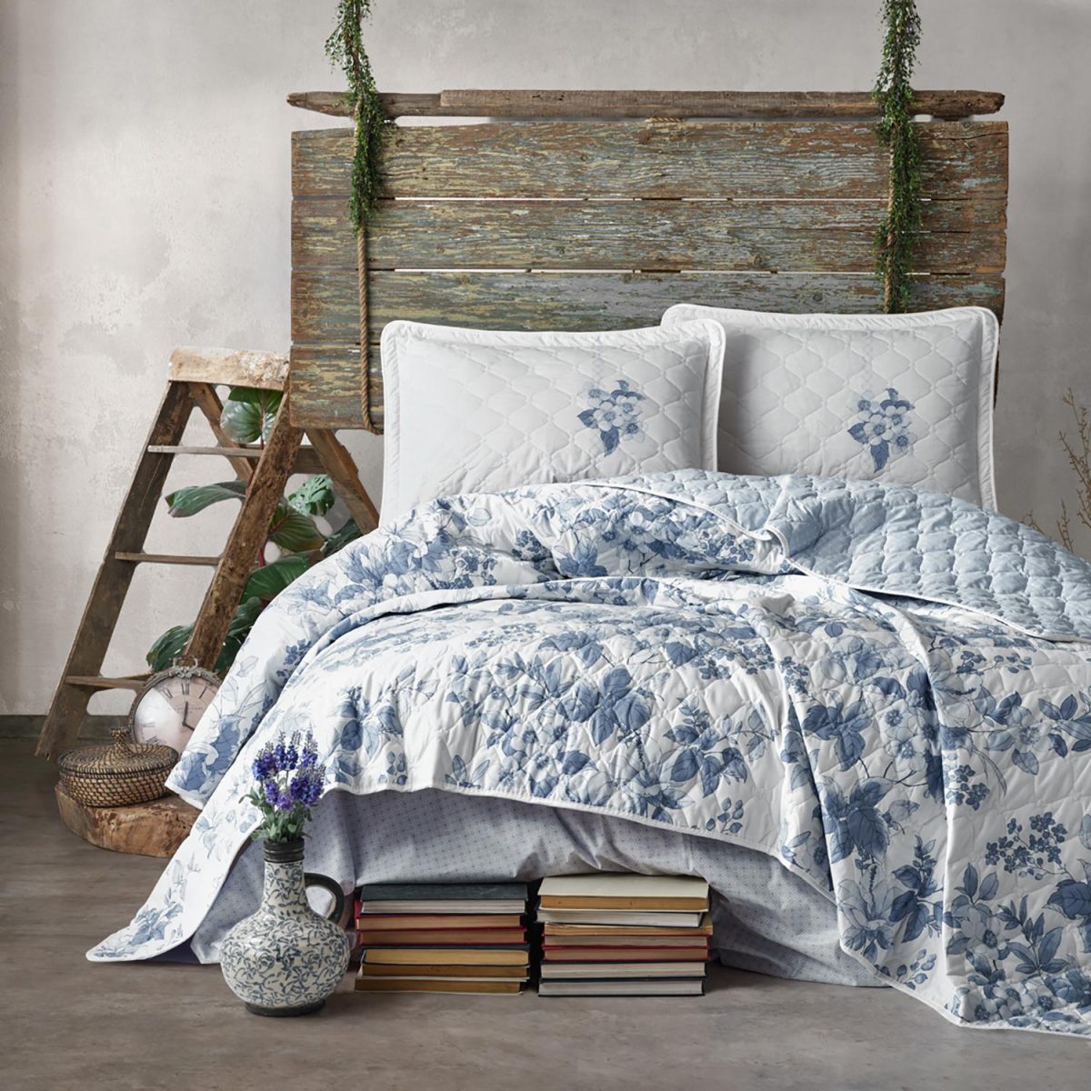 Cuvertură matlasată pentru pat dublu, realizată din bumbac 100% ranforce, cu imprimeu floral albastru pe fundal alb. Setul conține două fețe de pernă și poate fi folosit pe ambele fețe, fiind ușor de întreținut.