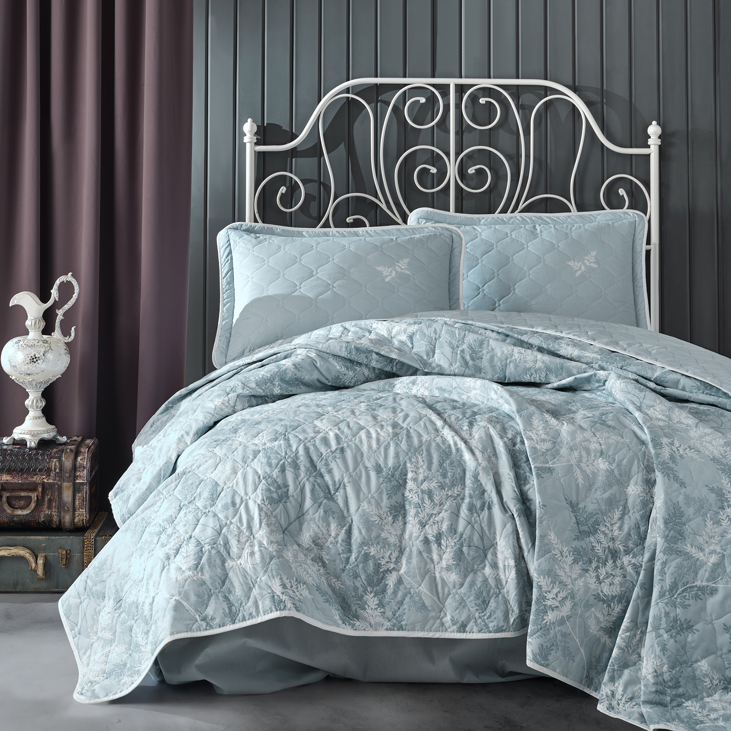 Cuvertură matlasată pentru pat dublu, realizată din bumbac ranforce 100%, în nuanțe de albastru și alb. Setul include două fețe de pernă și este reversibil, potrivit pentru utilizare zilnică și pentru decoruri în tonuri naturale.