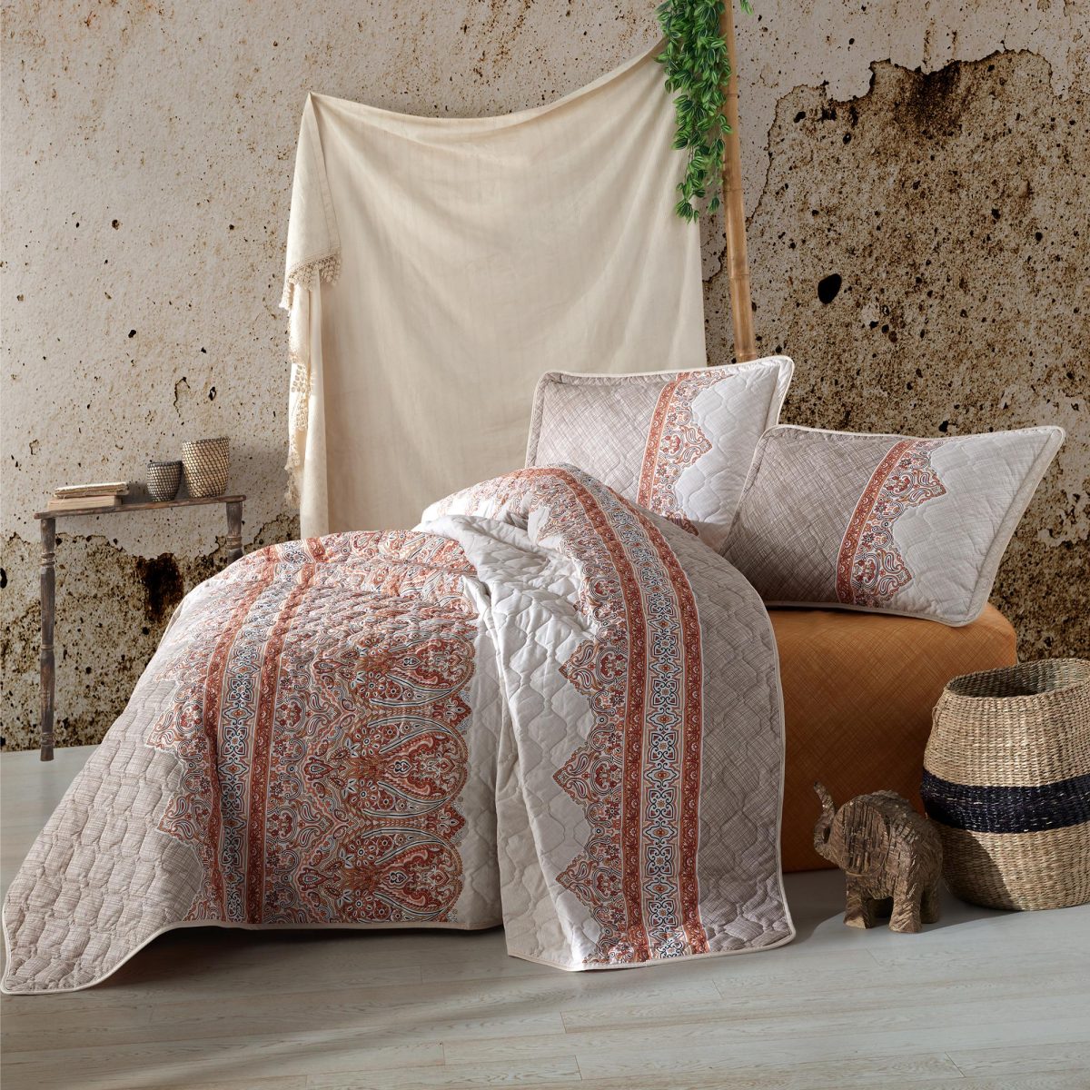 Cuvertură matlasată pentru pat dublu, din bumbac 100%, cu modele în nuanțe de bej și cărămiziu pe fundal alb. Setul include două fețe de pernă. Material moale, respirabil, reversibil, ideal pentru orice anotimp.