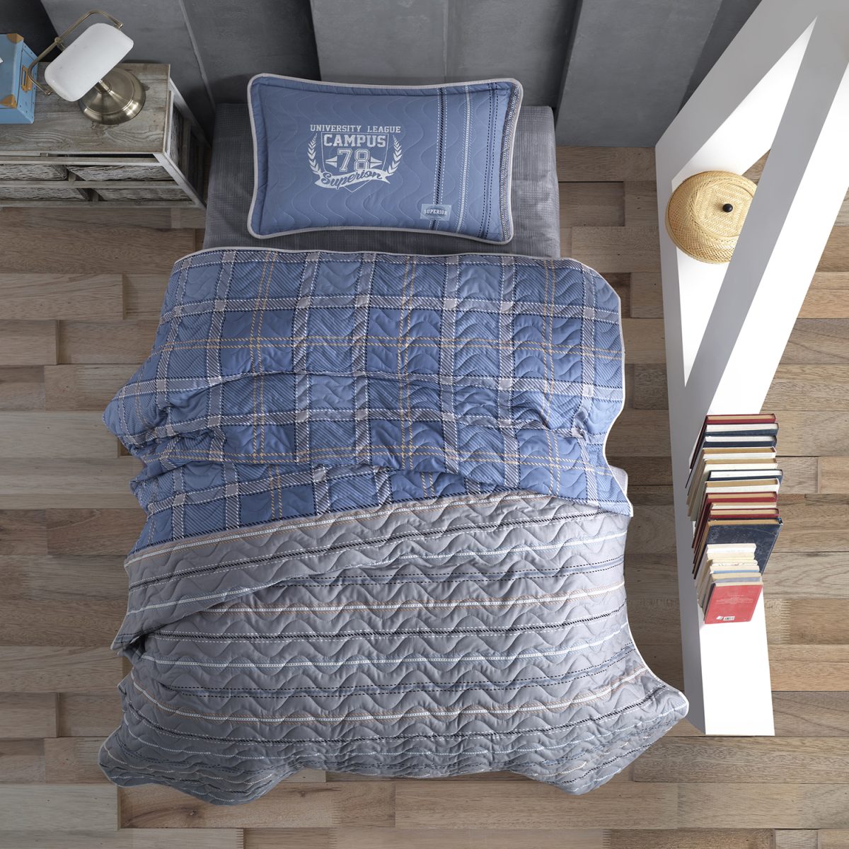Cuvertură matlasată reversibilă pentru o persoană, din bumbac 100% ranforce, cu o față gri și una cu carouri albastre. Include față de pernă albastră. Design sobru și echilibrat, potrivit pentru camere moderne sau spații de oaspeți.