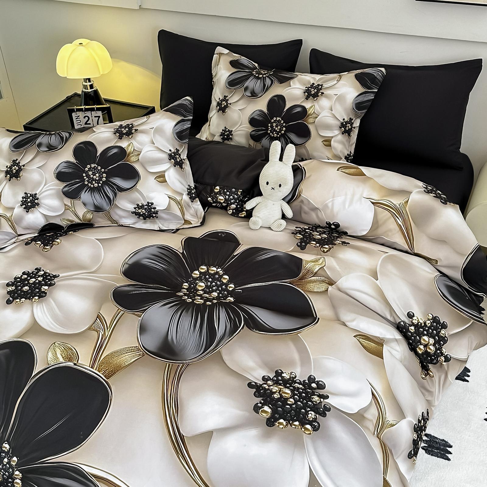 Lenjerie de Pat Finet – Imprimare Digitală 5D, 4 Piese, pentru 1 Persoană, Cearșaf cu Elastic-Floral