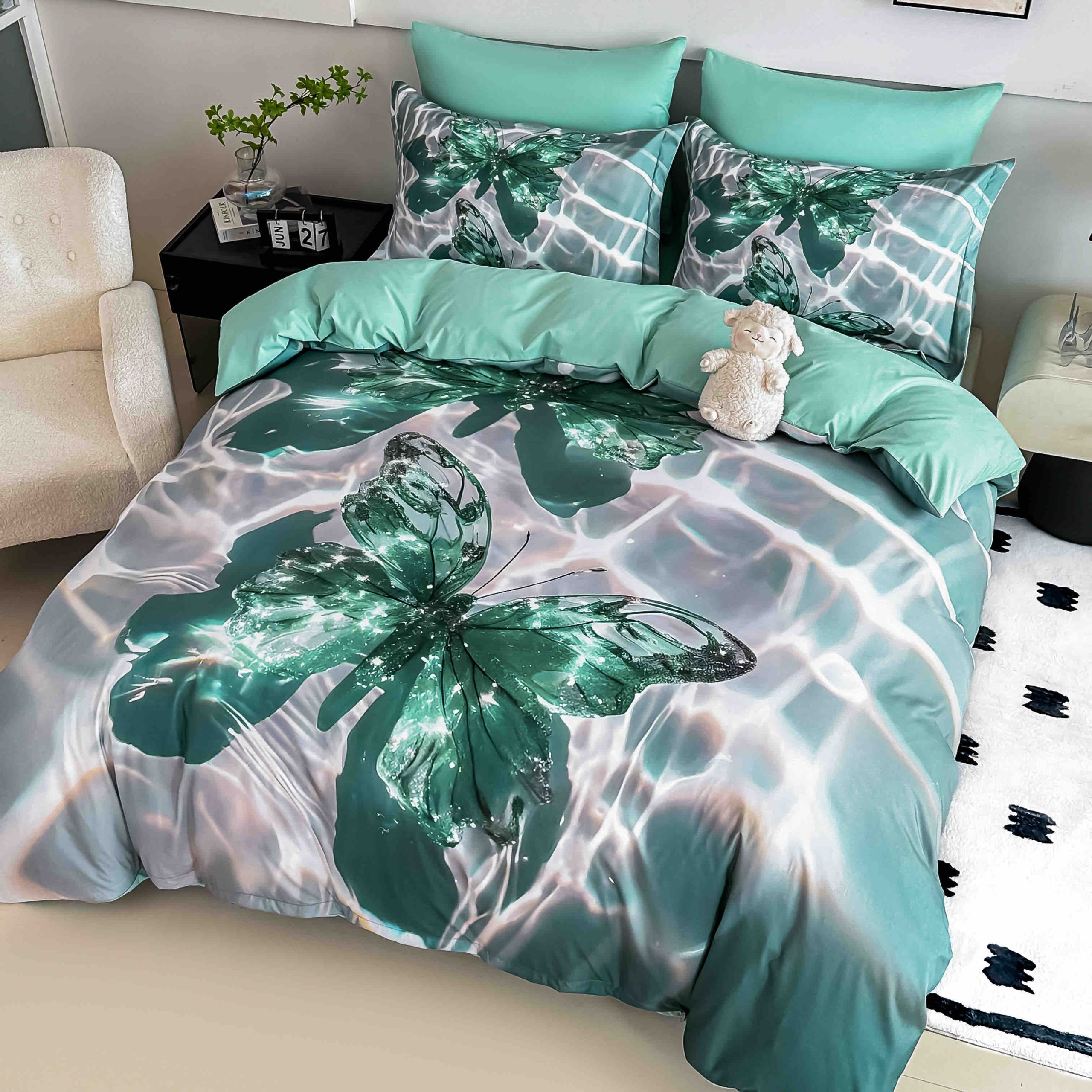 Lenjerie de Pat Finet – Imprimare Digitală 5D, 4 Piese, pentru 1 Persoană, Cearșaf cu Elastic-Fluturi5
