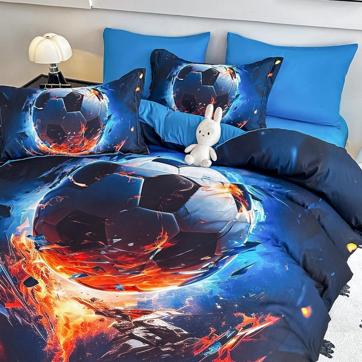 Lenjerie de Pat Finet – Imprimare Digitală 5D, 4 Piese, pentru 1 Persoană, Cearșaf cu Elastic-Fotbal