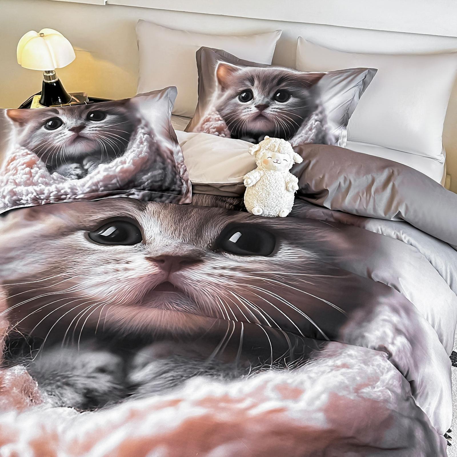 Lenjerie de Pat Finet – Imprimare Digitală 5D, 4 Piese, pentru 1 Persoană, Cearșaf cu Elastic-Pisica2