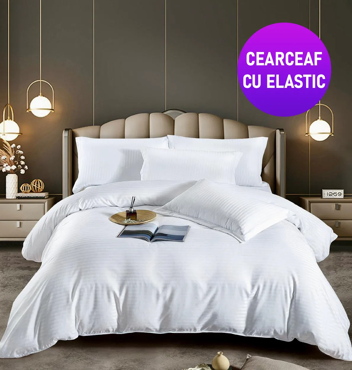 Lenjerie king size cu elastic Damasc Finet 6 piese Alb