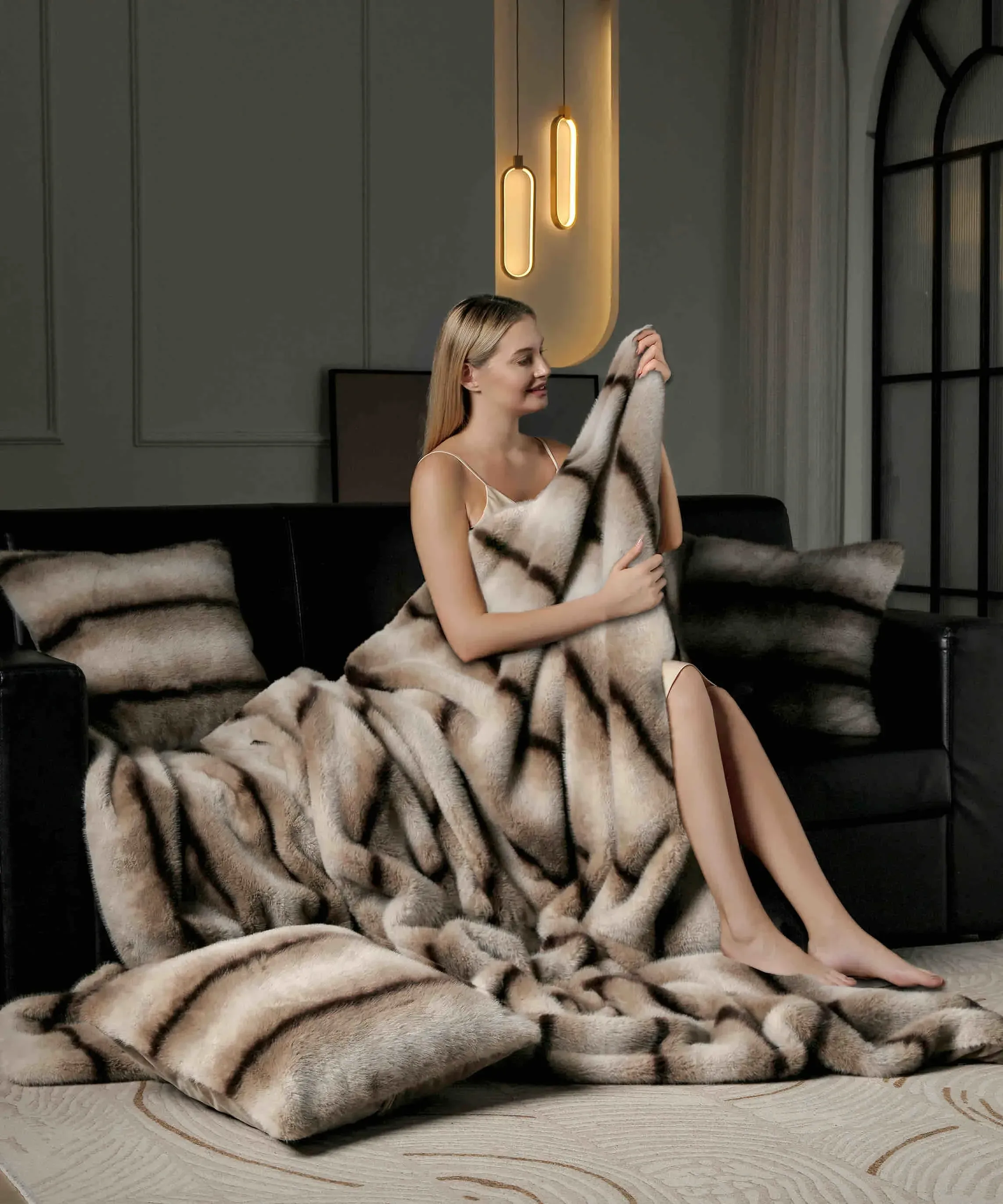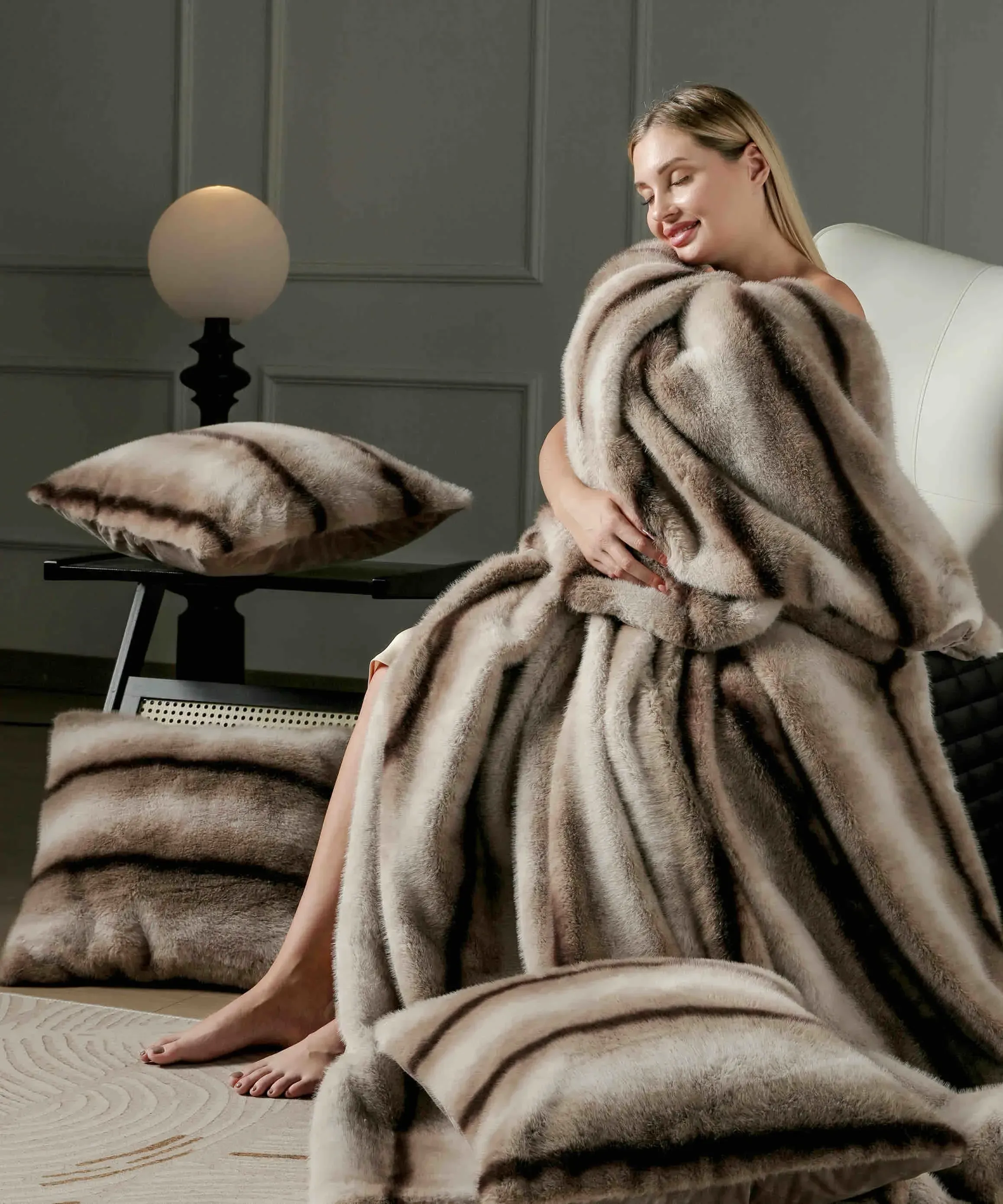 Aceasta lenjerie premium transforma orice dormitor intr-un spatiu elegant si confortabil. Fabricata din blana artificiala de nurca, impresioneaza prin textura sa fina si pufoasa, oferind o senzatie placuta la atingere.