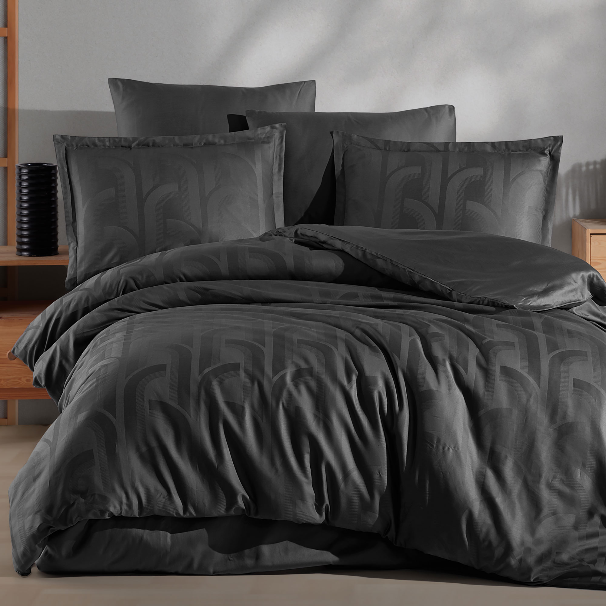 Set de lenjerie Pucioasa din bumbac 100%, în tonuri elegante de negru. Include cearșafuri și patru fețe de pernă, toate ambalate într-o cutie cadou, pentru un plus de rafinament și funcționalitate în orice dormitor.