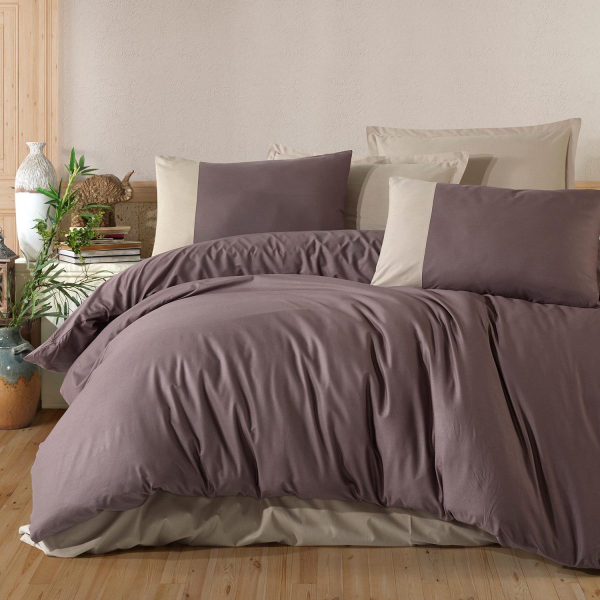 Set lenjerie de pat Pucioasa Ranforce din bumbac 100%, culoare bej pentru cearșaf de pat și maro pentru cearșaf de pilotă și fețele de pernă. Densitate 140 g/m². Ambalaj cutie cadou.