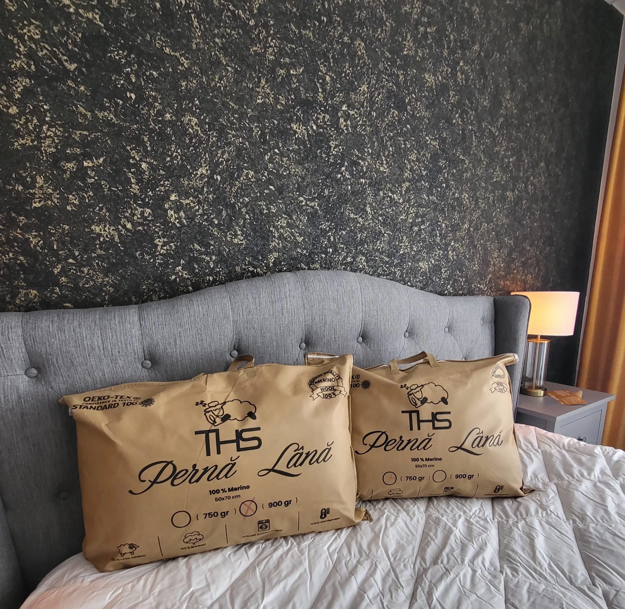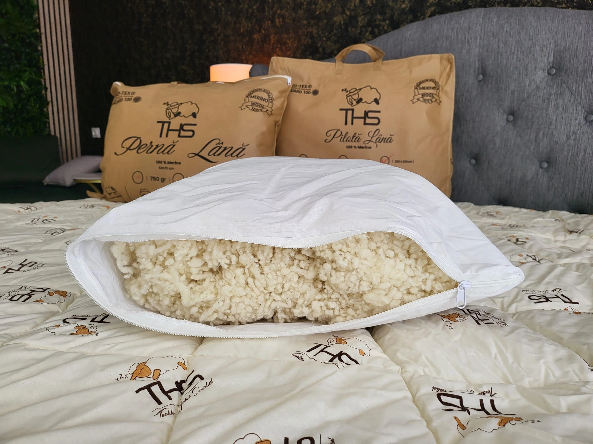 Pernă naturală 50×70 cm, 900 g total, umplutură 100% lână virgină merino, husă albă din bumbac OEKO-TEX® cu fermoar. Anti-aglomerare, spălare husă la mașină – program max. 60°C. Volum sporit și susținere medie → medie/fermă, păstrând respirabilitatea.