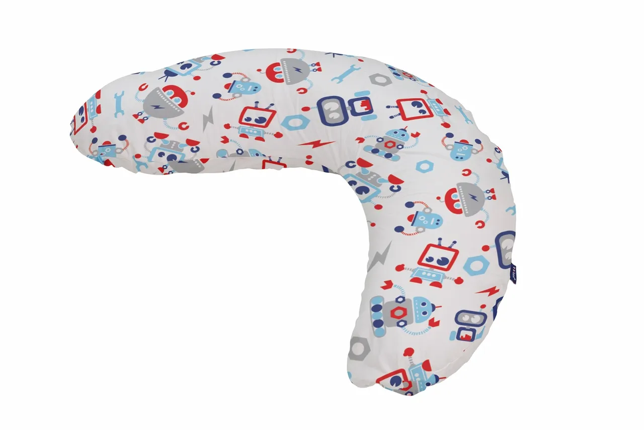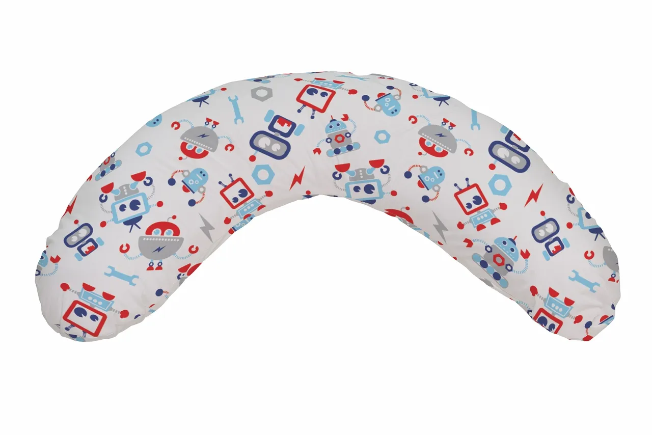Perna pentru alaptat Bebeluca Robots in forma de semiluna, este o perna cu forma ergonomica ce poate fi utilizata inca de la inceputul sarcinii, dar si in perioada alaptarii pentru suport.