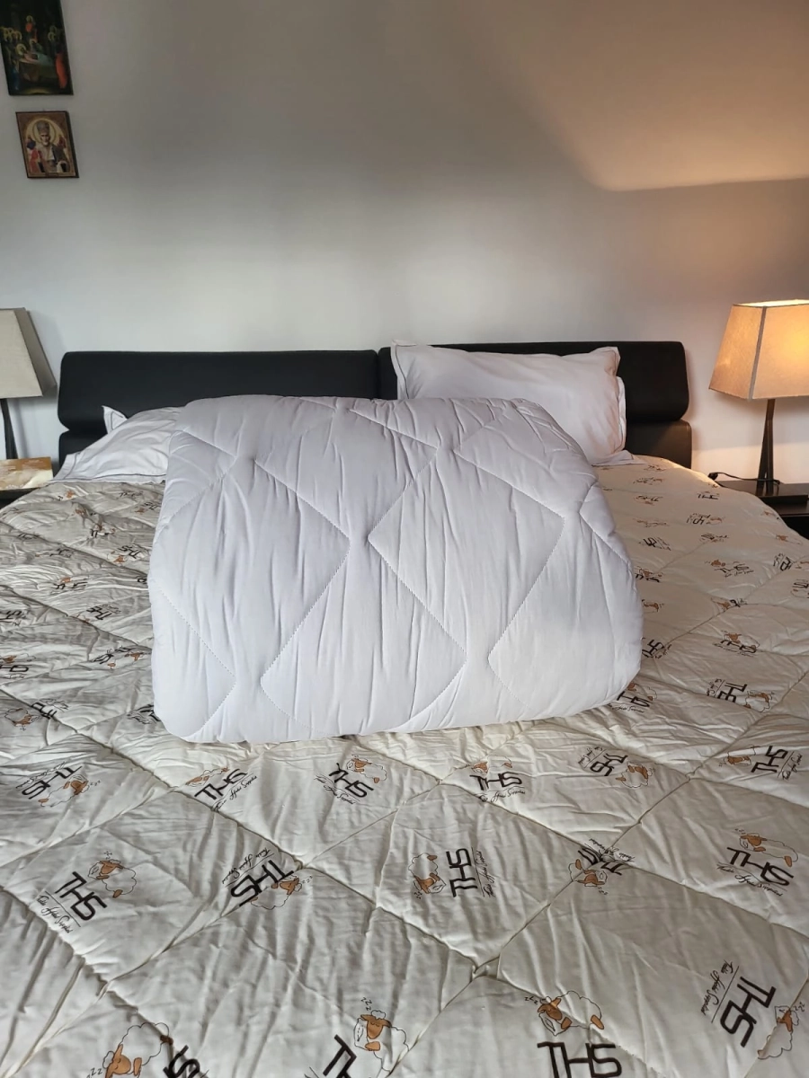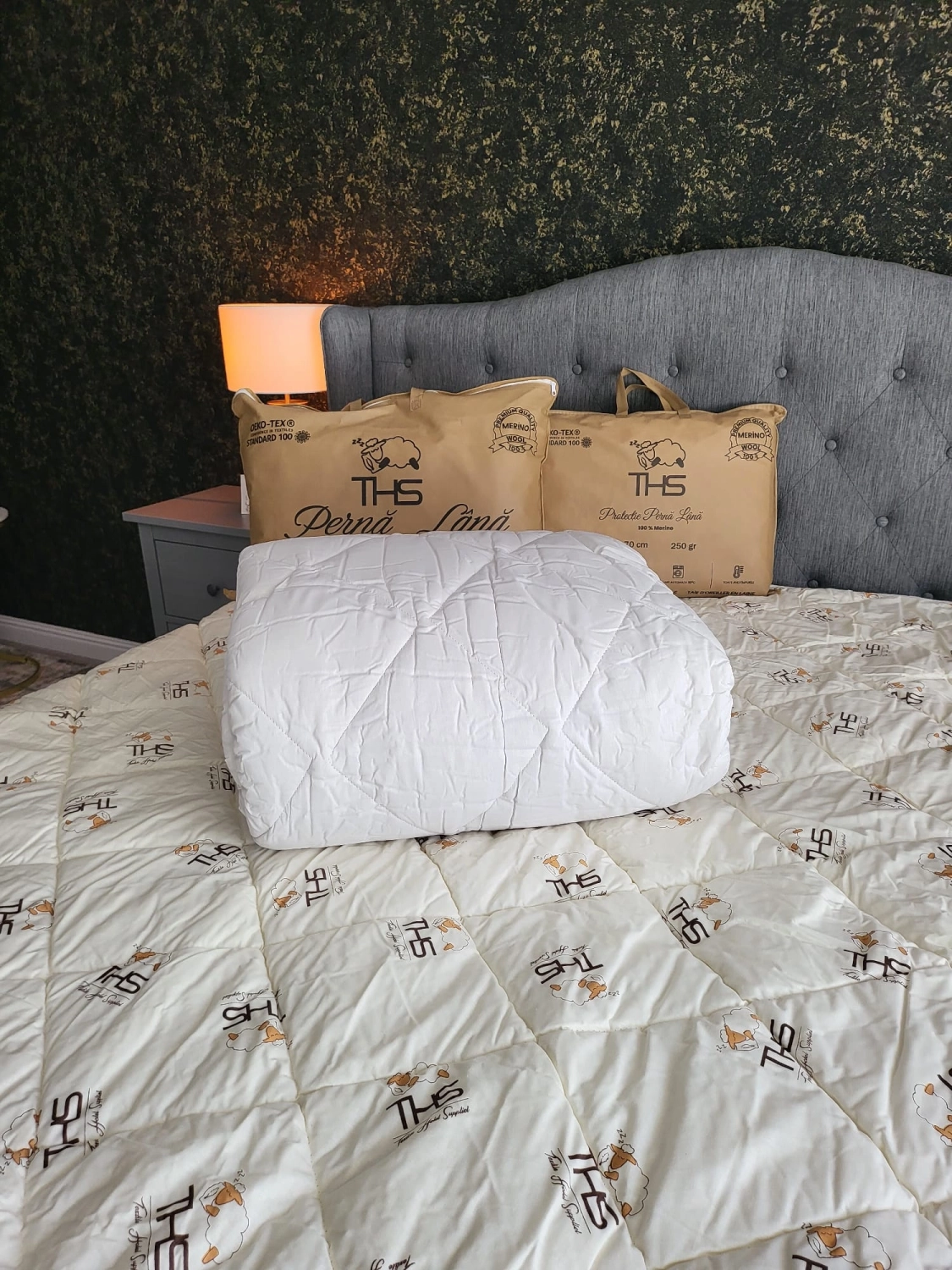 Pilotă premium 4 anotimpuri, lavabilă la mașină 30°C, lână merino 100%, înveliș alb/uni OEKO-TEX® 100 — căldură controlată, respirabilă, fără umiditate excesivă.