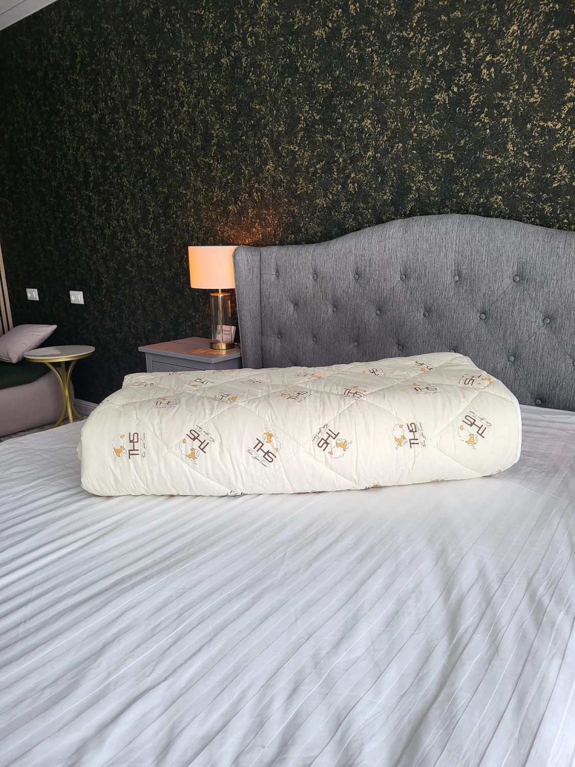 Pilotă premium 4 anotimpuri, lavabilă la mașină (program lână 30°C), lână merino 100% și înveliș crem „oiță” OEKO-TEX® 100 — volum plin, respirabil și confort termic controlat.