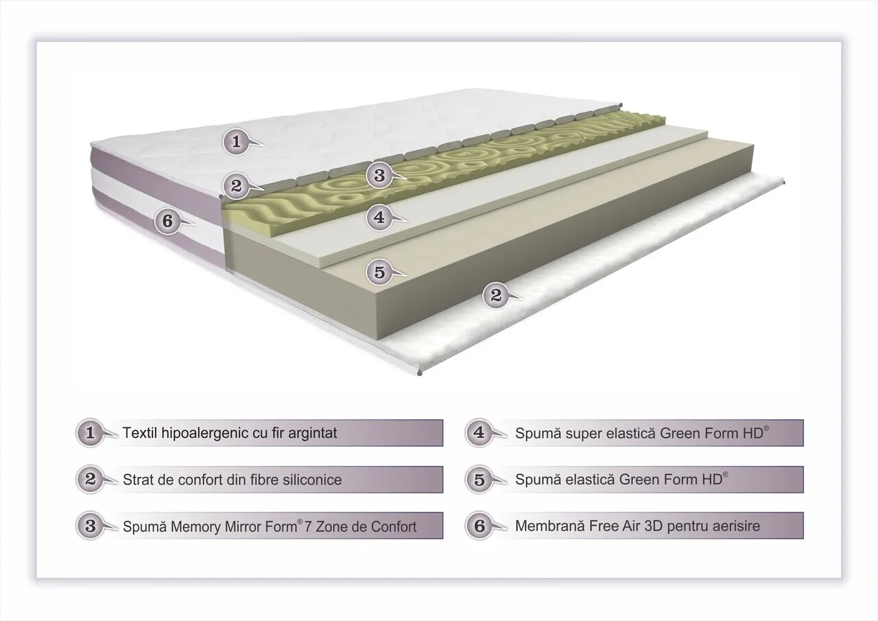 - 3 cm de spuma super elastica Green Form HD® care actioneaza ca un strat intermediar de mini arcuri intre baza de suport al corpului si cel de memory. Are rolul de a imbunatati sustinerea corpului in zonele lombara, cervicala si a genunchilor.