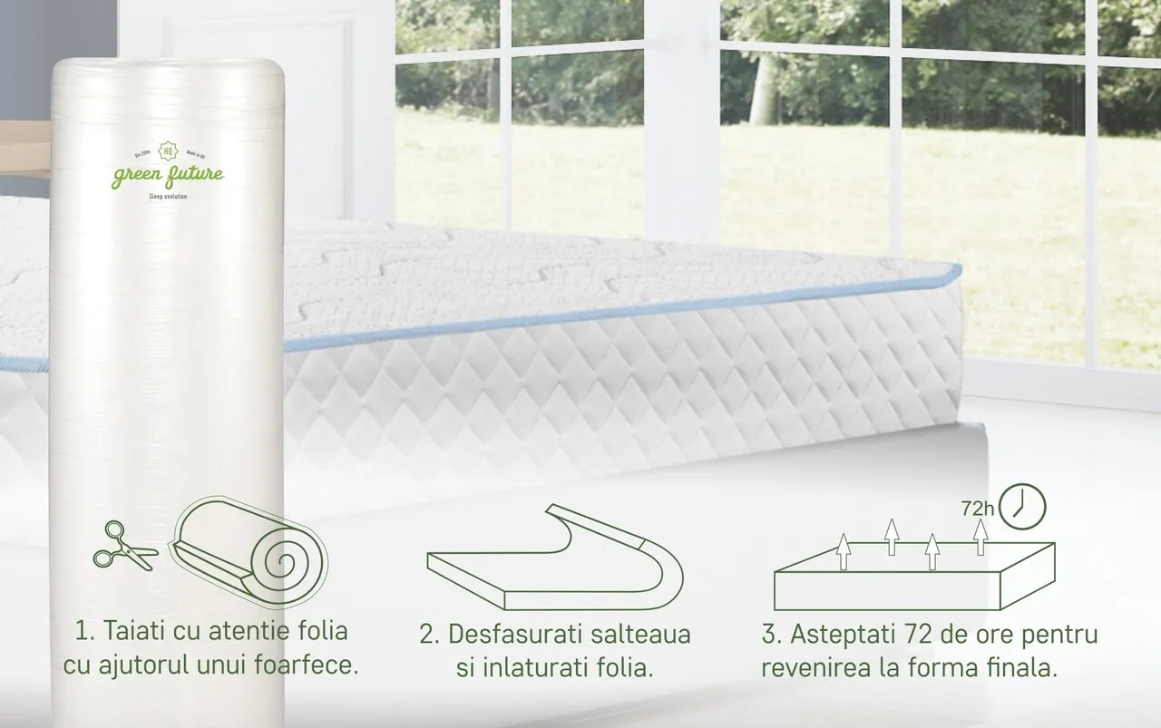• desfaceti cu grija folia de protectie, fara a folosi cutitul sau alte obiecte taioase care ar putea deterioara tesatura saltelei.