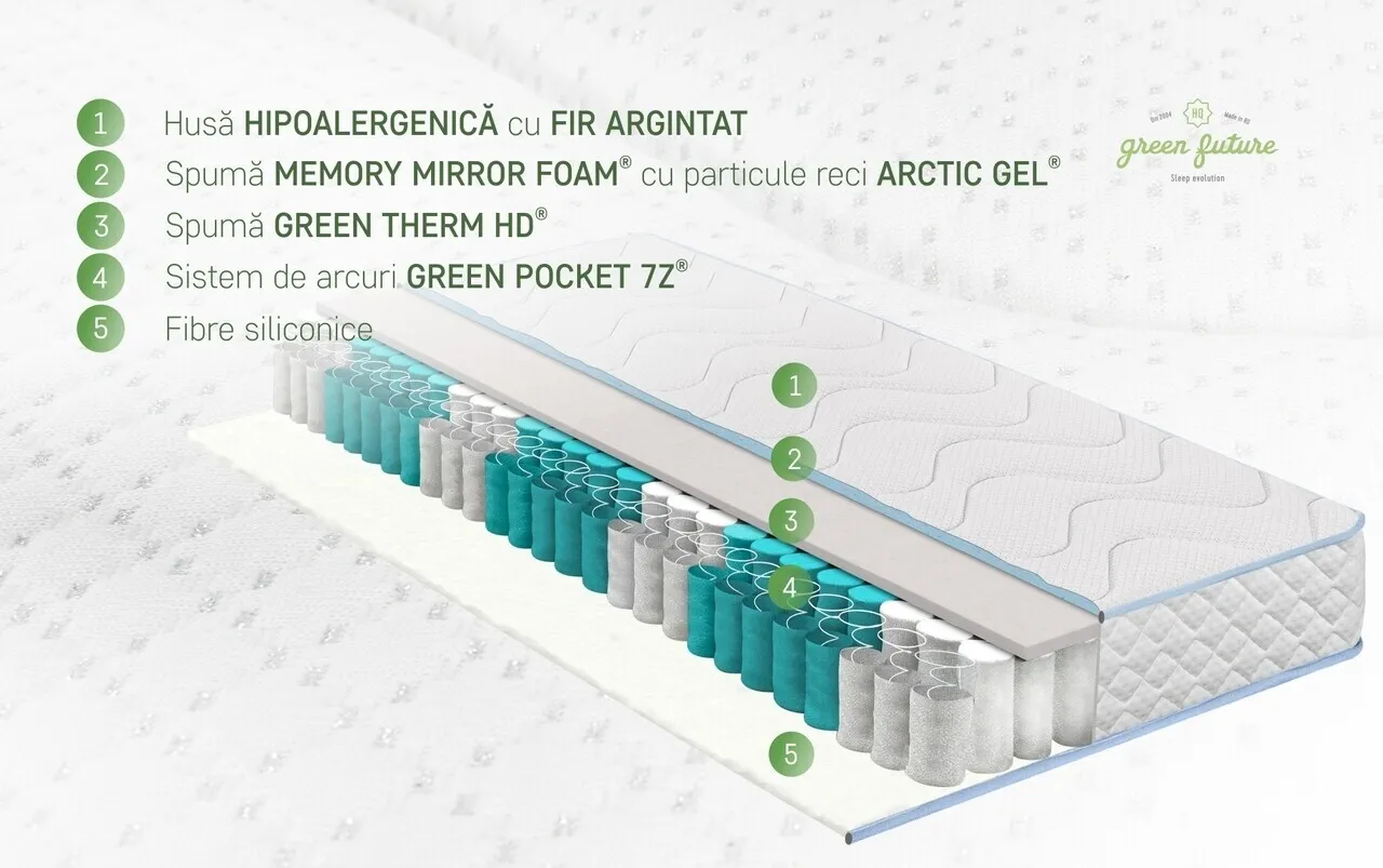 Tehnologia avansata a sistemului de Arcuri 7Z Green Pocket® impreuna cu cea a stratului de Green Therm Memory® asigura un somn fara propagarea miscarilor partenerului.