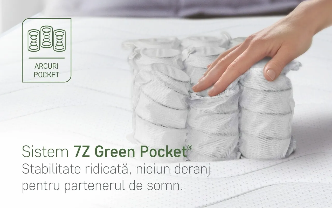 Arcurile sunt impachetate individual in casete de textile si actioneaza independent la presiunea exercitata asupra lor mulandu-se astfel perfect anatomic pe corp. Nevand legaturi intre ele nu angreneaza in miscare celelalte arcuri oferind stabilitate ridicata si zero deranj pentru partenerul de somn. In plus sistemul 7Z Green Pocket® permite un suport diferit al partilor corpului in functie de presiunea exercitata de acestea pe suprafata saltelei pentru a asigura o aliniere corecta si sanatoasa a vertebrelor coloanei.