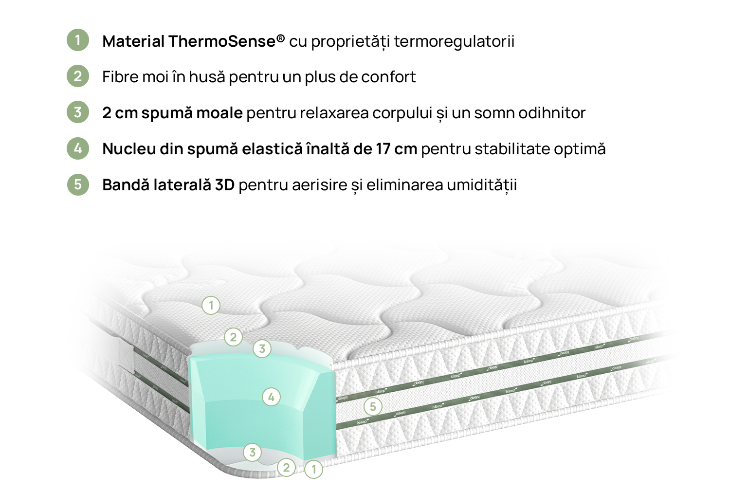 Materialul respirabil ThermoSense® reglează temperatura corpului pentru a asigura un mediu de somn sănătos și igienic. Pentru o mai bună circulație a aerului și eliminare a umidității, salteaua este echipată cu bandă laterală 3D respirabilă.