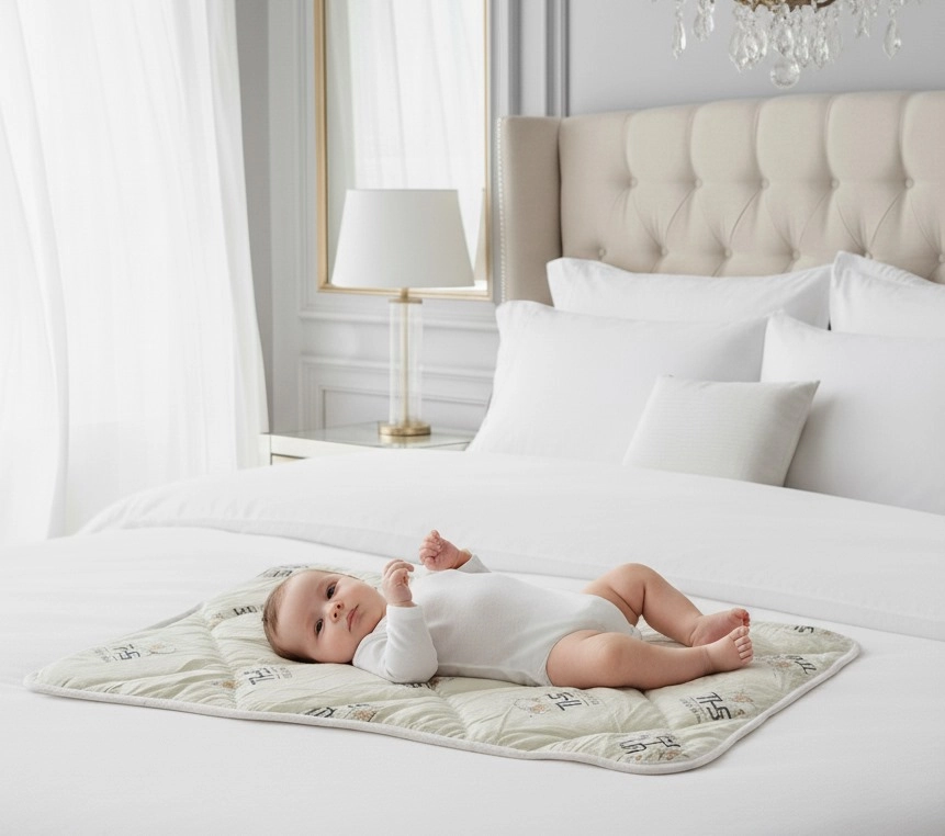 - Dimensiune: 50×70 cm — format practic pentru masă de înfășat sau pat.