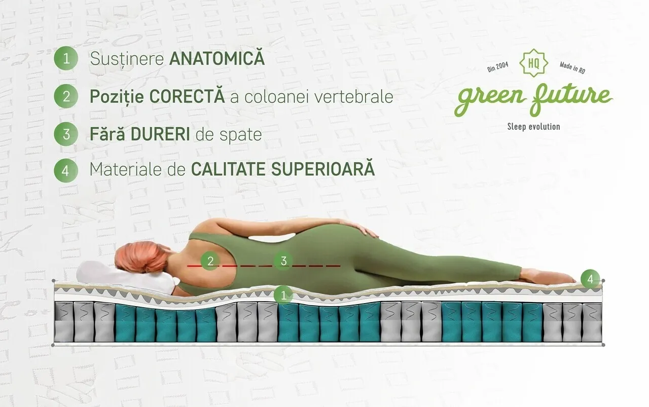Conceputa cu materiale de calitate superioara certificate Oeko-Tex, salteaua imbina tehnologia arcurilor impachetate individual tip Pocket cu cea a spumei super elastice Green Form HD® si a spumei Memory Mirror Form® pentru un confort ortopedic si anatomic excelent.