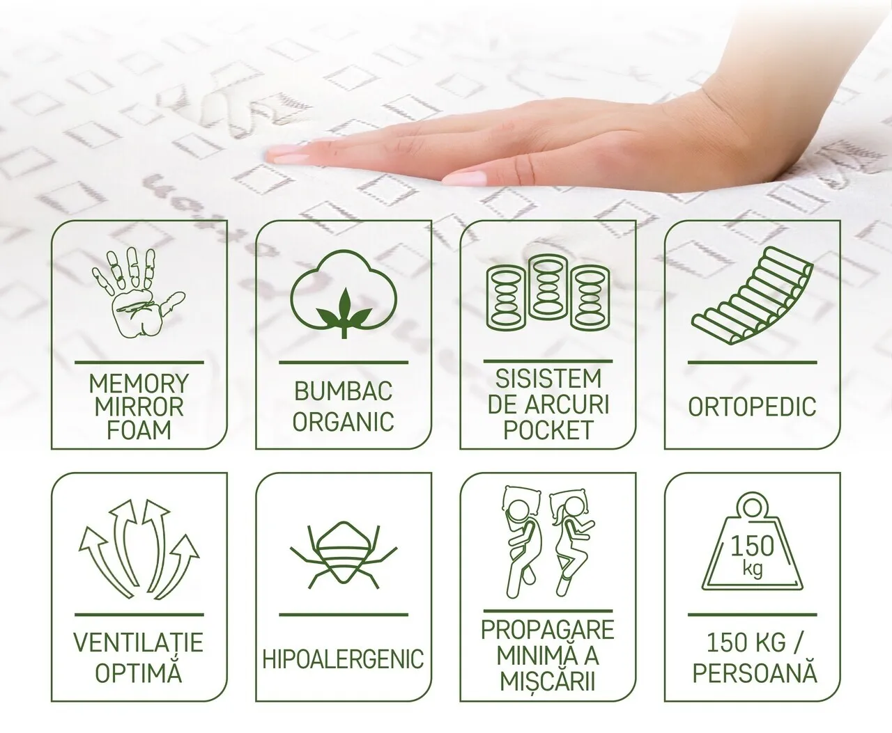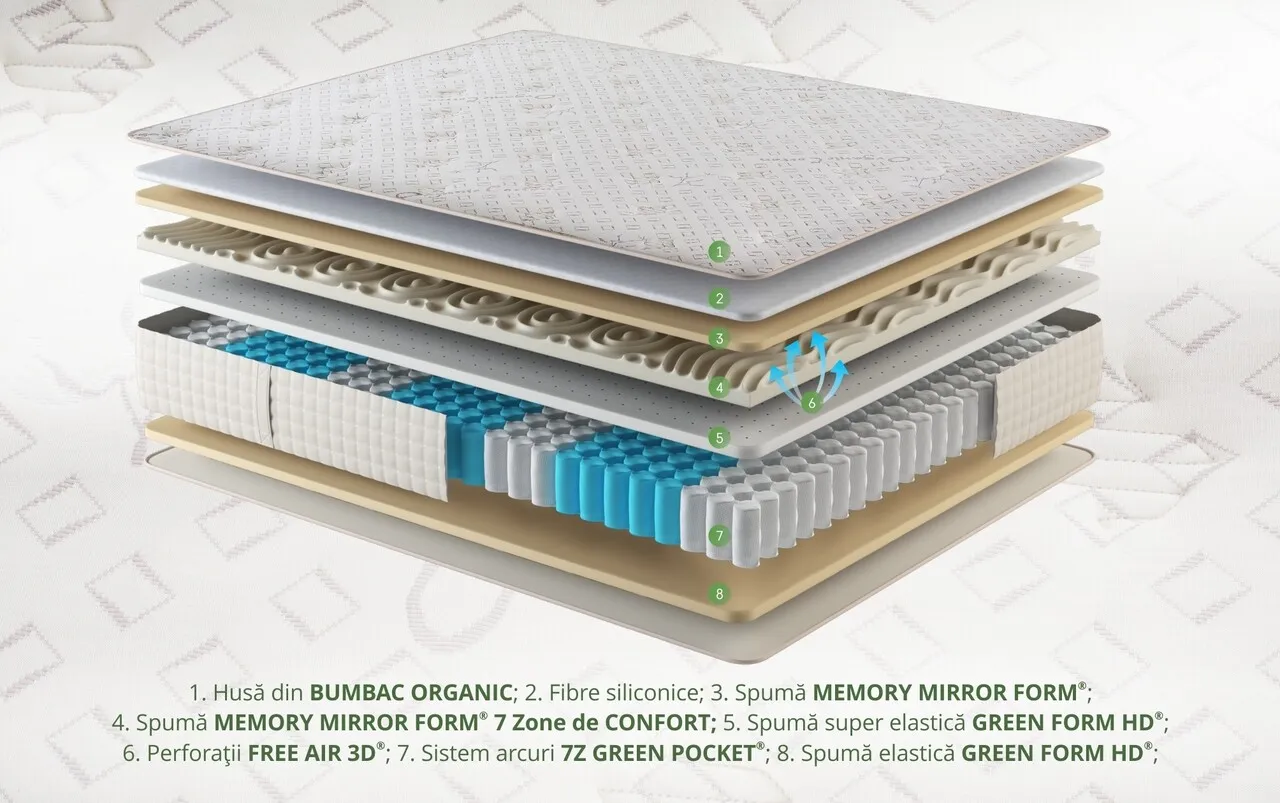 Conceputa cu materiale de calitate superioara certificate Oeko-Tex, salteaua imbina tehnologia arcurilor impachetate individual tip Pocket cu cea a spumei super elastice Green Form HD® si a spumei Memory Mirror Form® pentru un confort ortopedic si anatomic excelent.