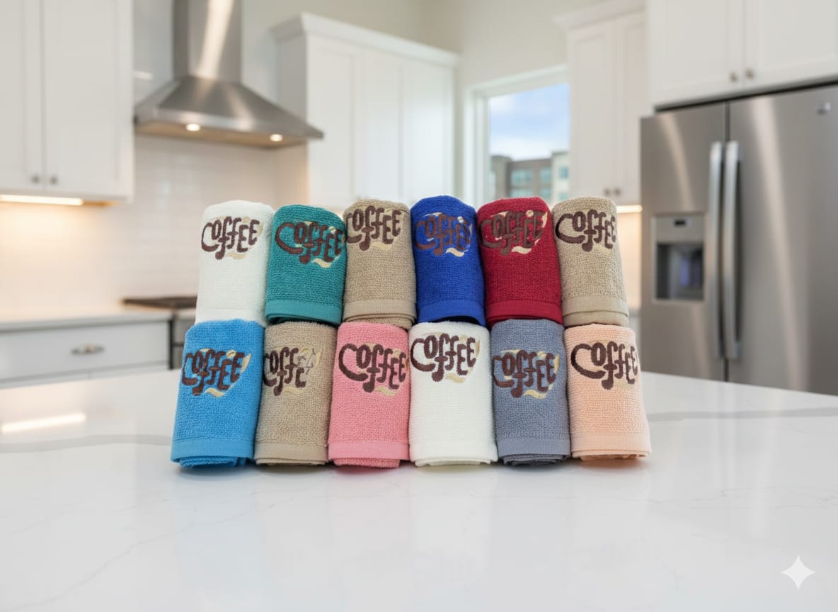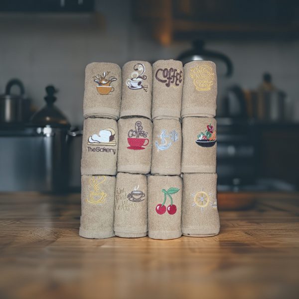 Acest set de 12 prosoape de bucătărie cu broderie cafea este alegerea perfectă pentru o bucătărie ordonată și elegantă. Confecționate din bumbac 100%, prosoapele sunt moi, durabile și extrem de absorbante, potrivite pentru ștersul veselei, mâinilor sau suprafețelor de lucru.
