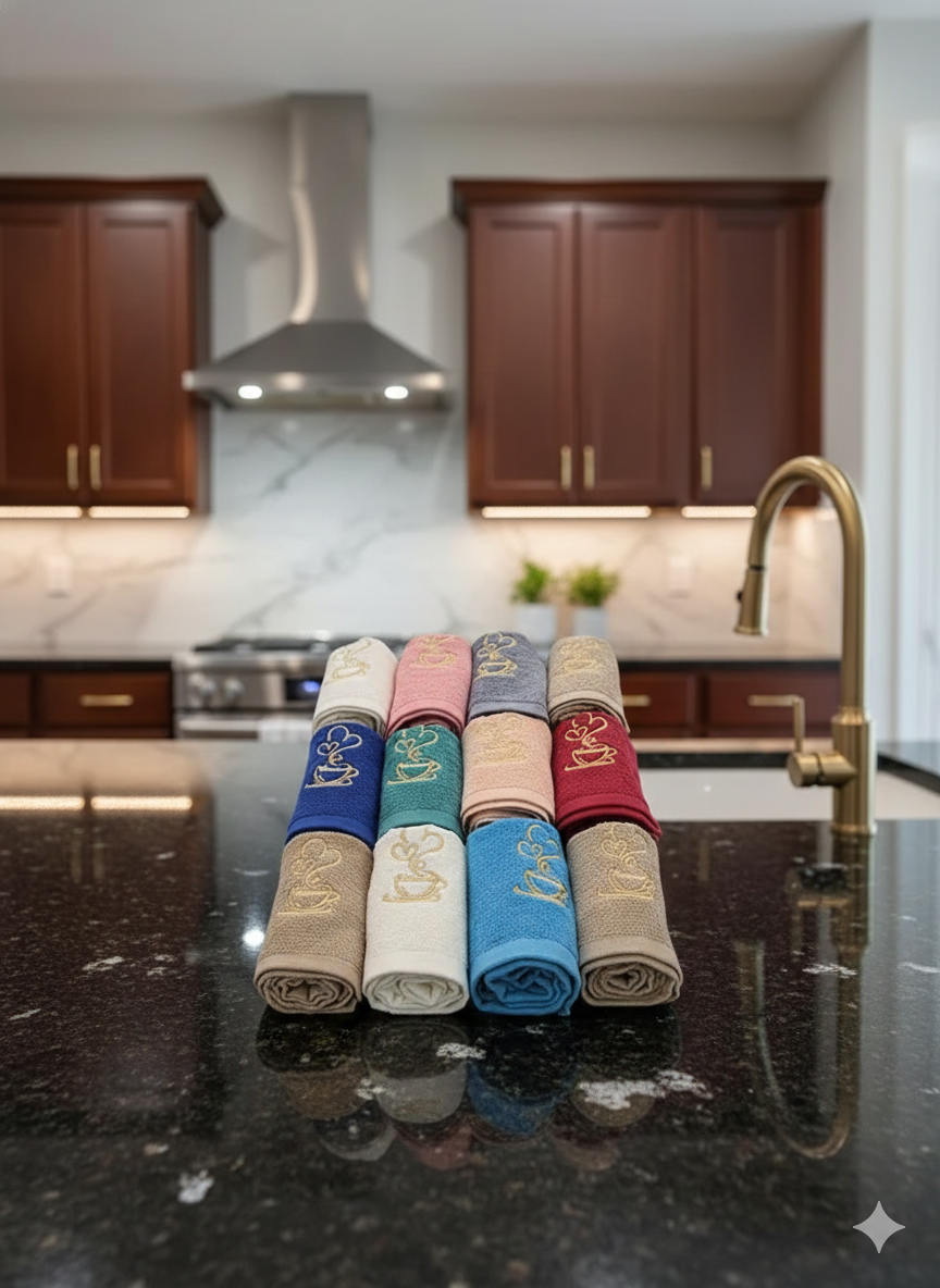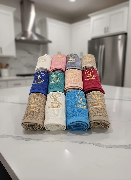 Acest set de 12 prosoape de bucătărie cu broderie cafea este alegerea perfectă pentru o bucătărie ordonată și elegantă. Confecționate din bumbac 100%, prosoapele sunt moi, durabile și extrem de absorbante, potrivite pentru ștersul veselei, mâinilor sau suprafețelor de lucru.