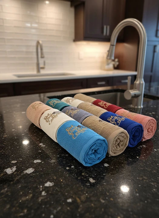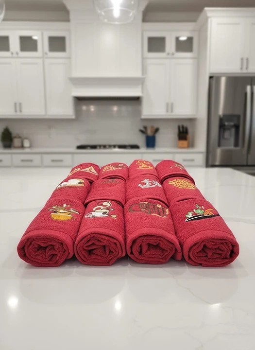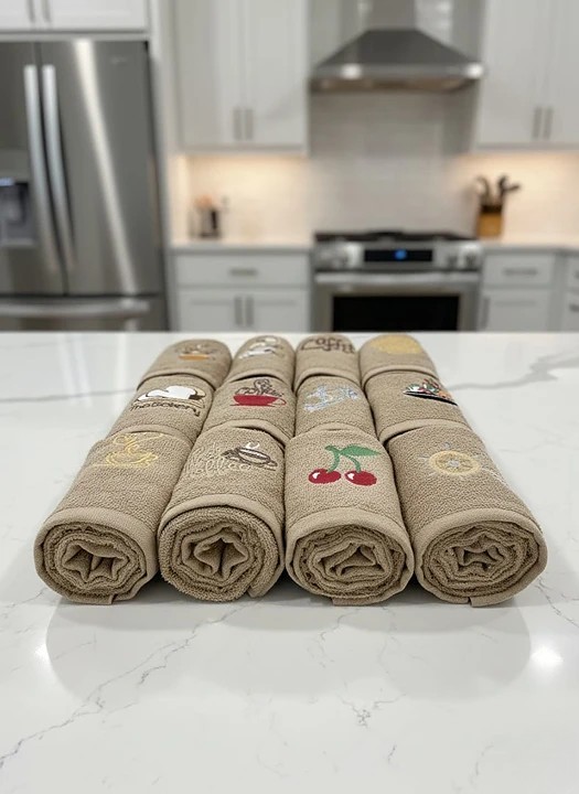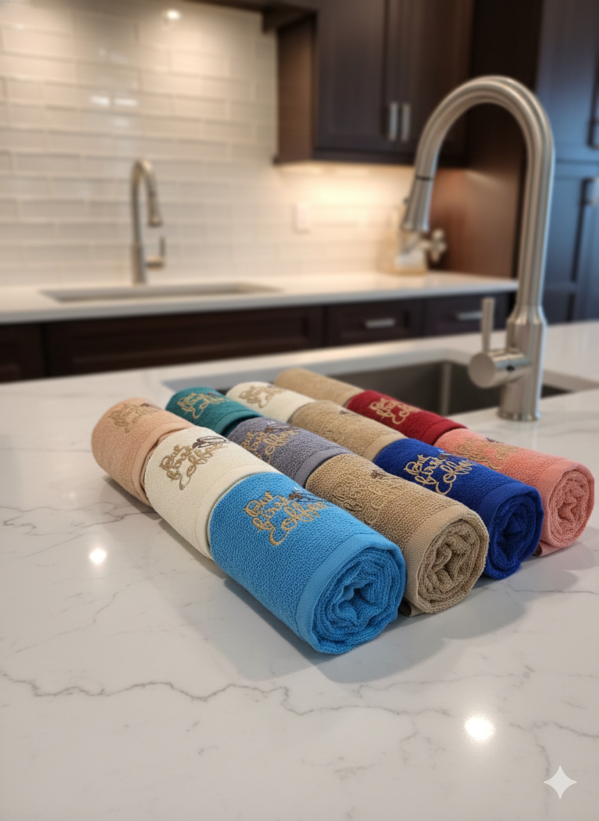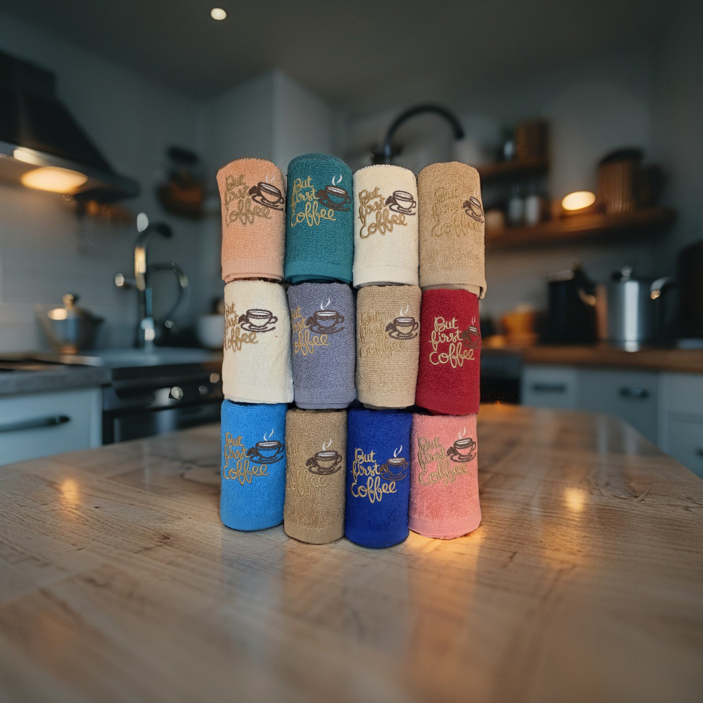 Acest set de 12 prosoape de bucătărie cu broderie cafea este alegerea perfectă pentru o bucătărie ordonată și elegantă. Confecționate din bumbac 100%, prosoapele sunt moi, durabile și extrem de absorbante, potrivite pentru ștersul veselei, mâinilor sau suprafețelor de lucru.