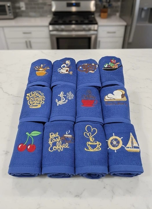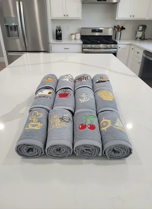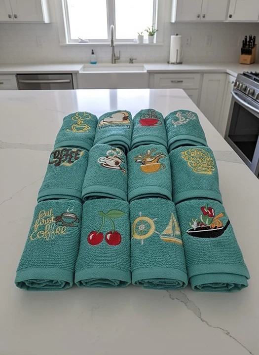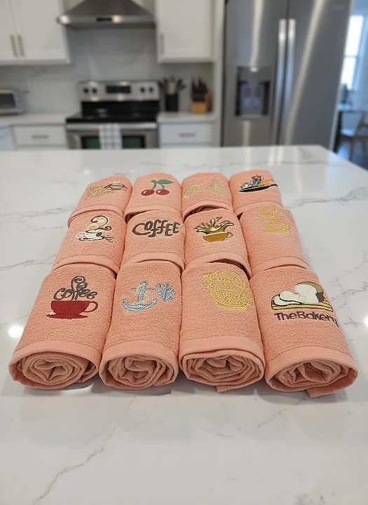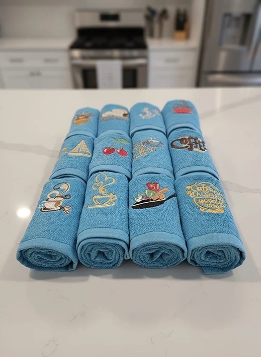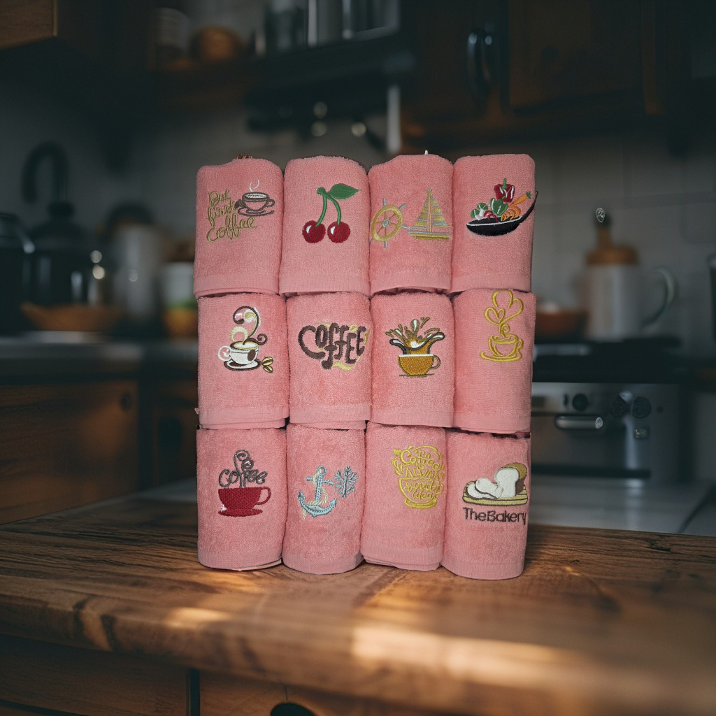 Set de 12 prosoape de bucatarie broderie cafea , din bumbac 100%, foarte absorbante, cu broderie decorativă și agățătoare integrată. Dimensiune 30×50 cm, ideale pentru orice gospodărie.