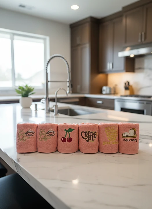 Set de 12 prosoape de bucătărie Coral, din bumbac 100%, foarte absorbante, cu broderie decorativă și agățătoare integrată. Dimensiune 30×50 cm, ideale pentru orice gospodărie.